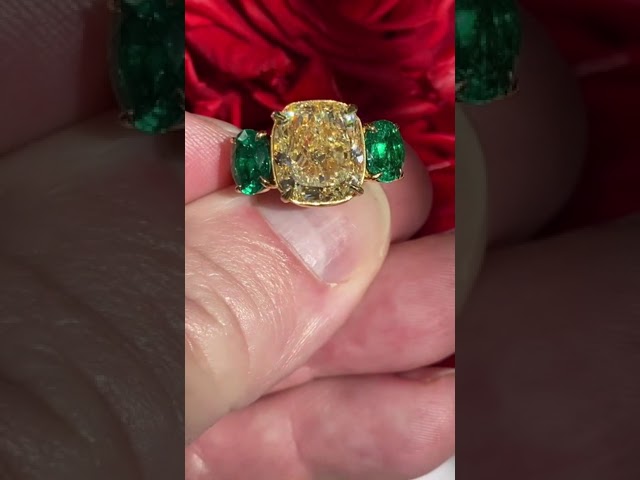 5ct Cushion Cut Yellow Sapphire Flanked By 2 Oval Cut Emeralds Yellow Gold Handmade Engagement Ring