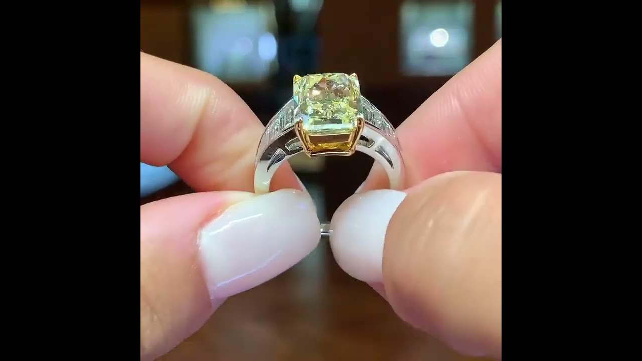 5ct Emerald Cut Yellow Sapphire With Geometric Trapeze Side Diamonds Two Tone Engagement Ring