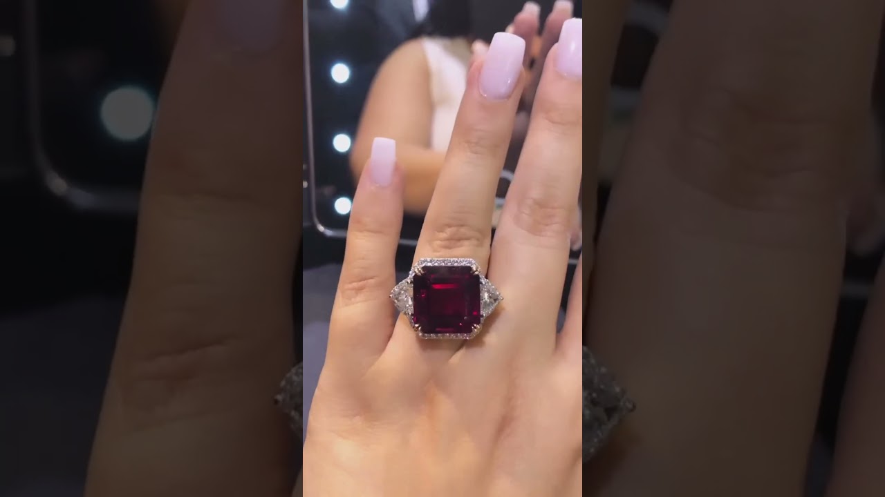 7ct Asscher Cut Ruby Halo Three Stone Paved Yellow Gold Prong Ring