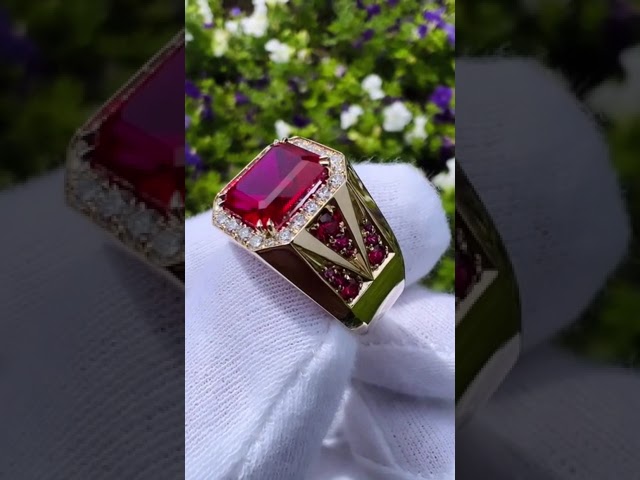 6.5ct Emerald Cut Ruby Halo Handmade Yellow Gold Men's Ring