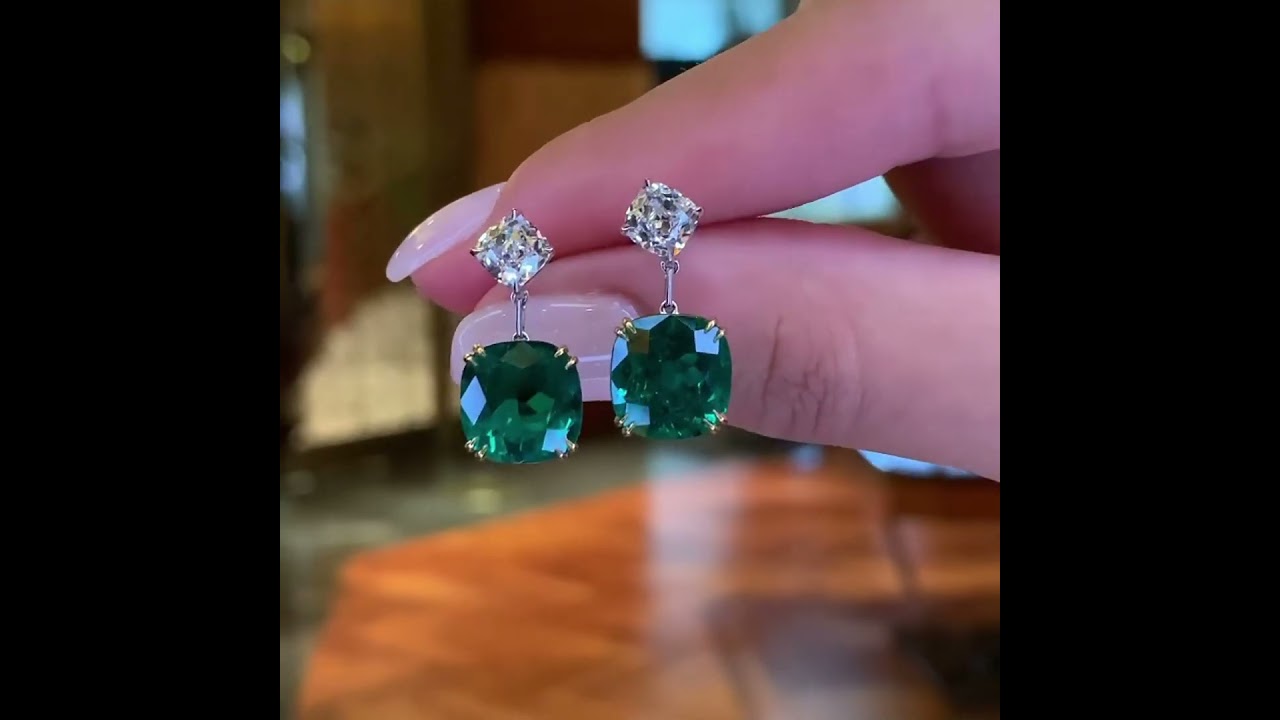 9ctw Cushion Cut Emerald & White Sapphire Two Tone Drop Earrings