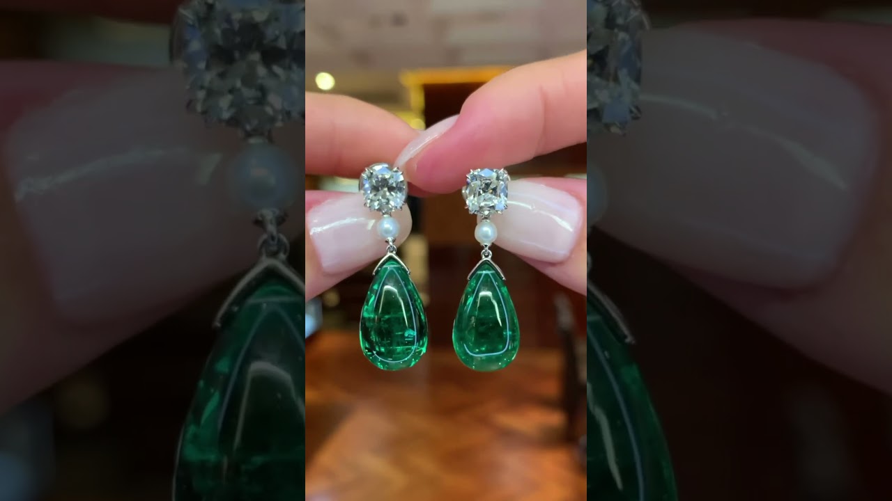 14.2ctw Pear Shape Cabochon Emerald With Cushion Cut White Sapphire Drop Earrings